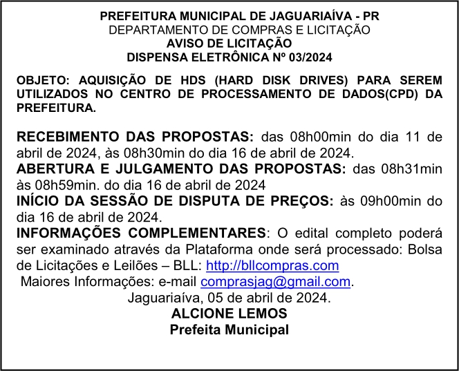 Aviso de Licitação Dispensa Eletrônica Nº 03/2024