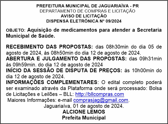 Aviso de Licitação Dispensa Eletrônica Nº 09/2024