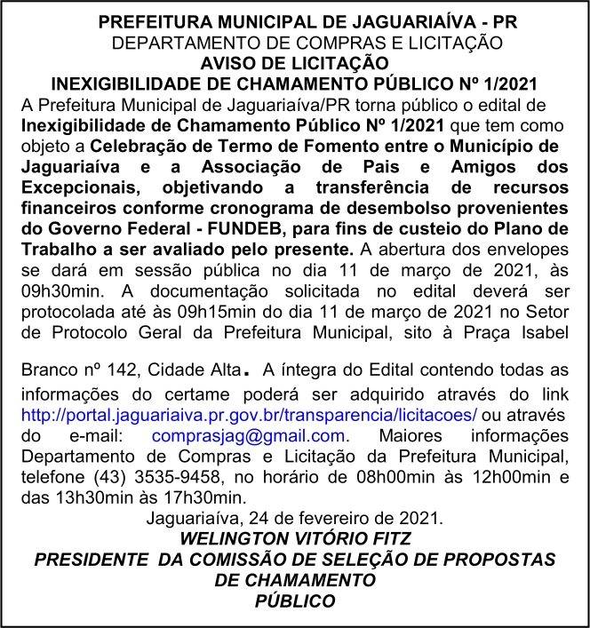 Aviso de Licitação Inexigibilidade de Chamamento Público Nº 01/2021