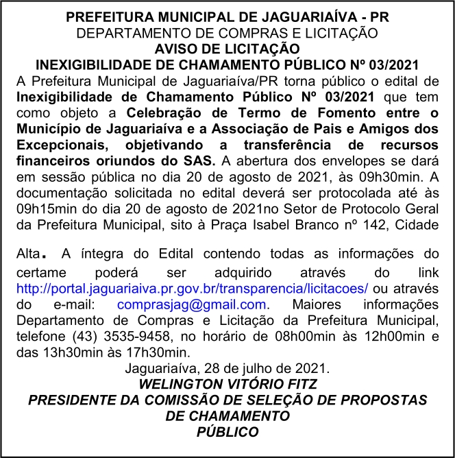 Aviso de Licitação Inexigibilidade de Chamamento Público Nº 03/2021