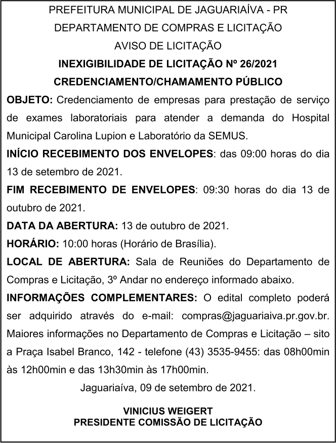 Aviso de Licitação Inexigibilidade de Licitação Credenciamento/Chamamento Público Nº 26/2021