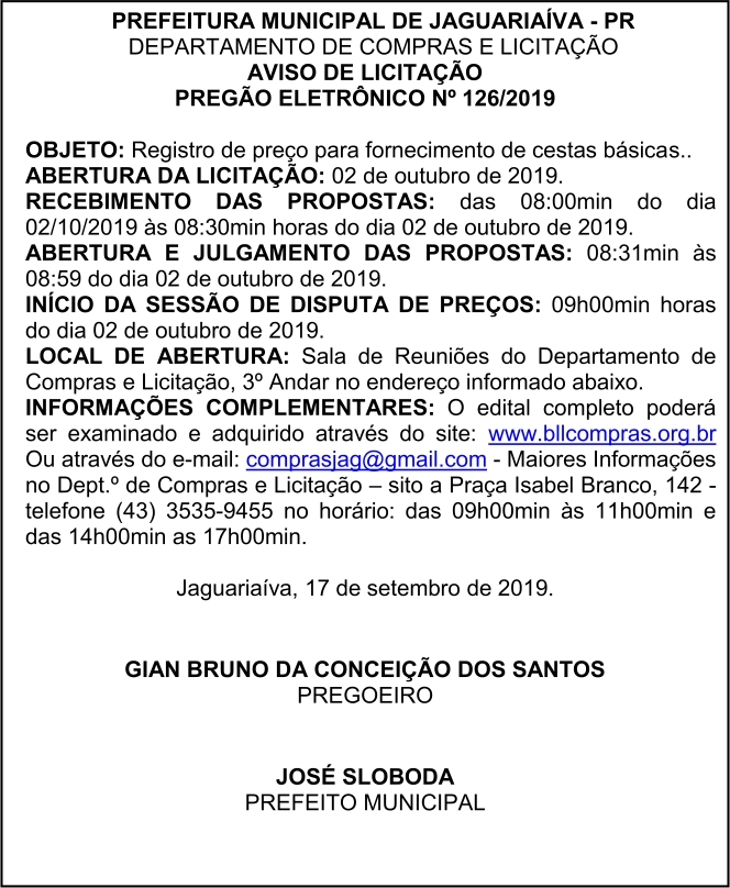 Aviso de Licitação Pregão Eletrônico 126/2019