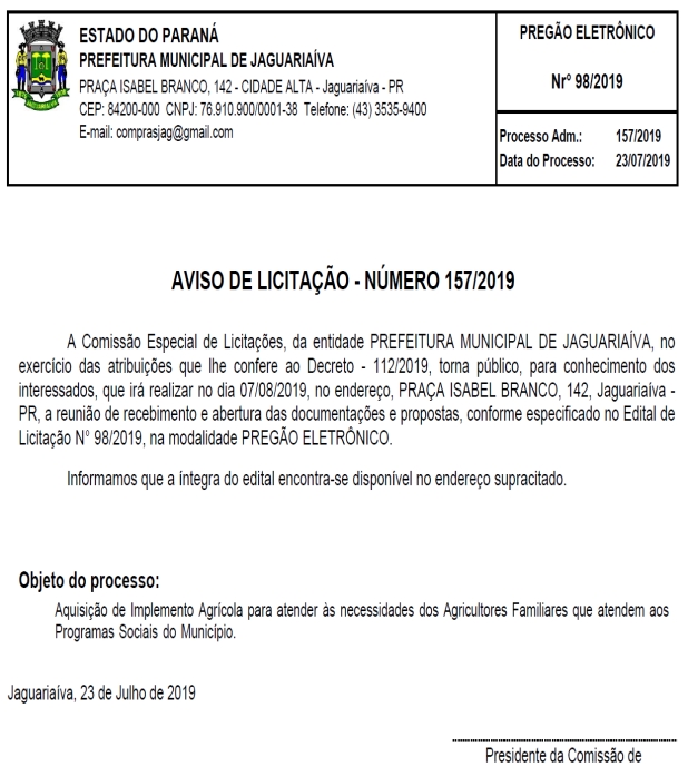 Aviso de Licitação Pregão Eletrônico 98/2019