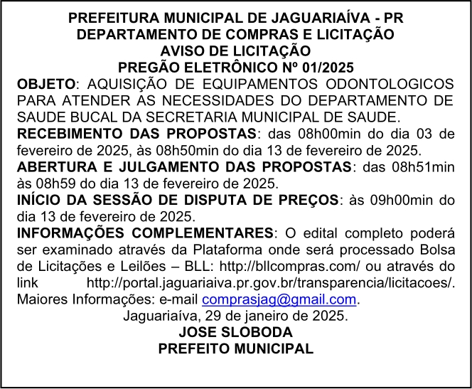 Aviso de Licitação Pregão Eletrônico Nº 01/2025