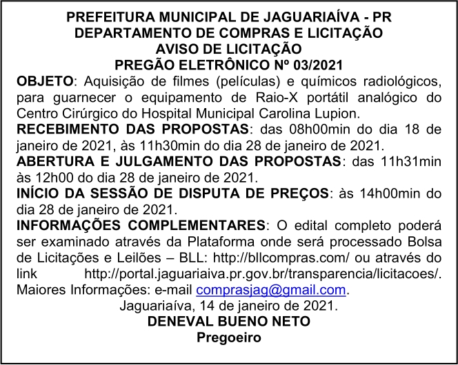 Aviso de Licitação Pregão Eletrônico Nº 03/2021
