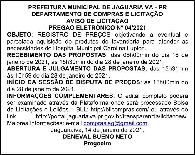 Aviso de Licitação Pregão Eletrônico Nº 04/2021