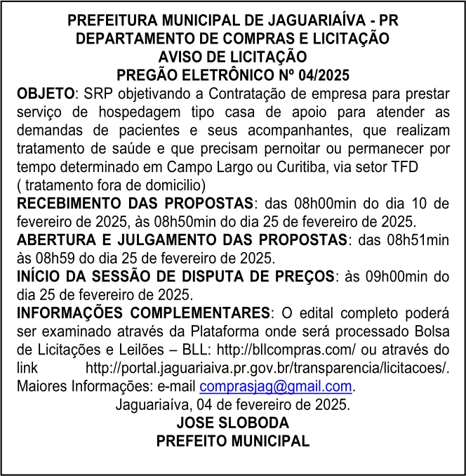 Aviso de Licitação Pregão Eletrônico Nº 04/2025