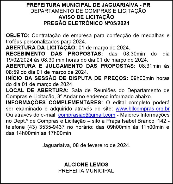 Aviso de Licitação Pregão Eletrônico Nº 05/2024