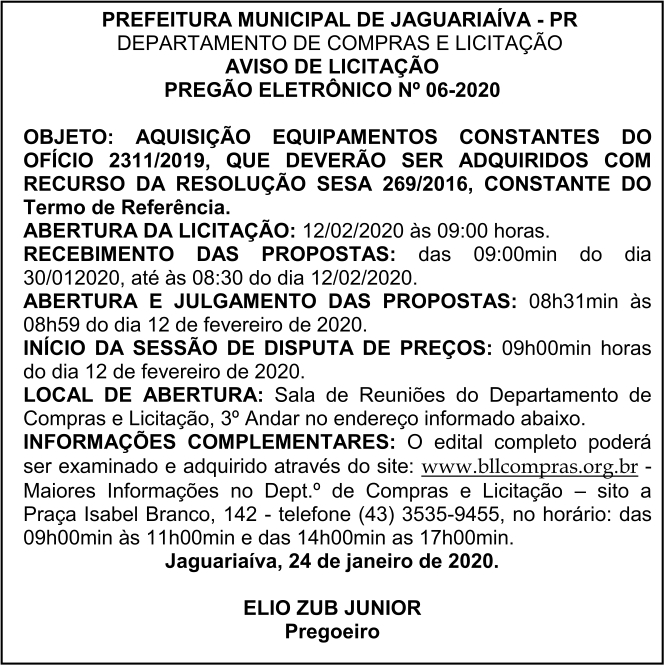 Aviso de Licitação Pregão Eletrônico Nº 06/2020