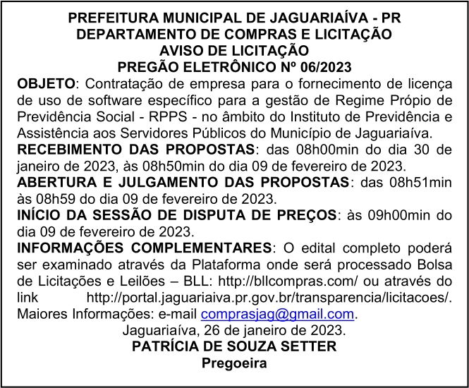 Aviso de Licitação Pregão Eletrônico Nº 06/2023