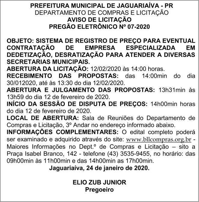 Aviso de Licitação Pregão Eletrônico Nº 07/2020