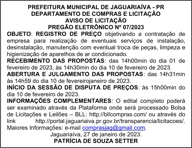 Aviso de Licitação Pregão Eletrônico Nº 07/2023