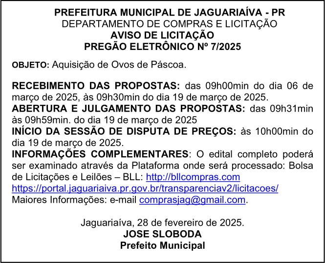 Aviso de Licitação Pregão Eletrônico Nº 07/2025