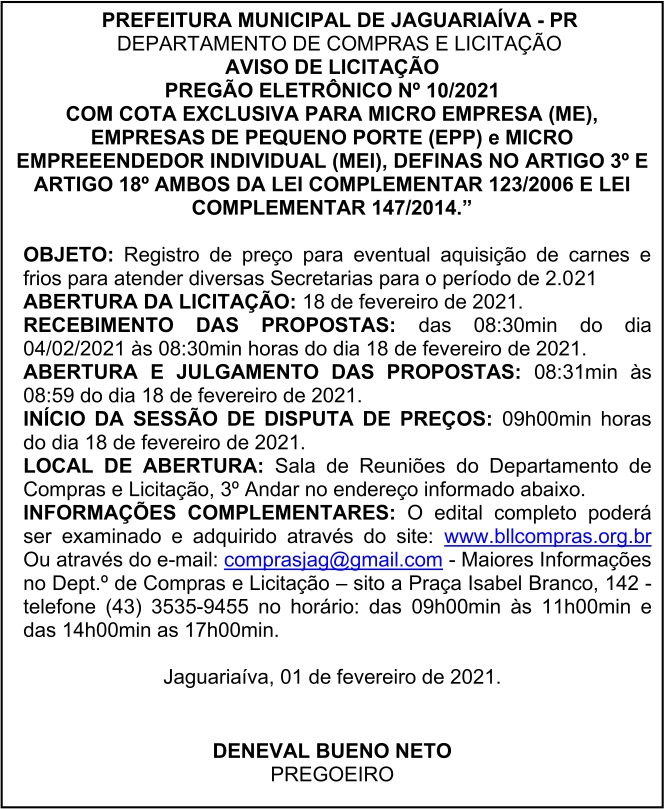 Aviso de Licitação Pregão Eletrônico Nº 10/2021