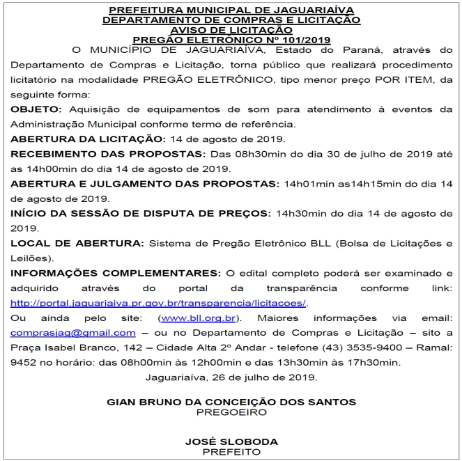Aviso de Licitação Pregão Eletrônico Nº 101/2019