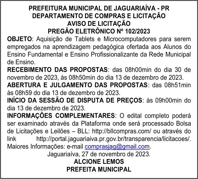 Aviso de Licitação Pregão Eletrônico Nº 102/2023