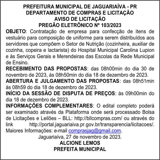 Aviso de Licitação Pregão Eletrônico Nº 103/2023