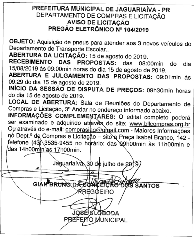 Aviso de Licitação Pregão Eletrônico Nº 104/2019