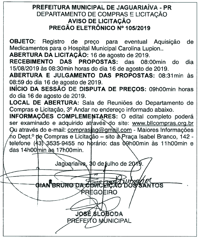 Aviso de Licitação Pregão Eletrônico Nº 105/2019