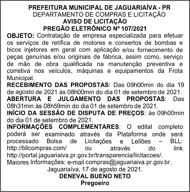 Aviso de Licitação Pregão Eletrônico Nº 107/2021