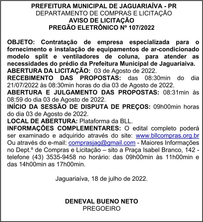 Aviso de Licitação Pregão Eletrônico Nº 107/2022