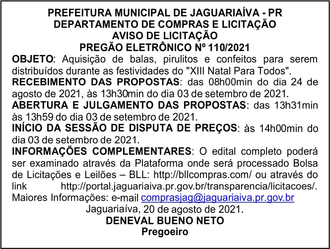 Aviso de Licitação Pregão Eletrônico Nº 110/2021
