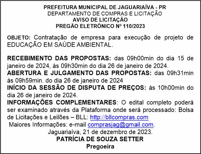 Aviso de Licitação Pregão Eletrônico Nº 110/2023
