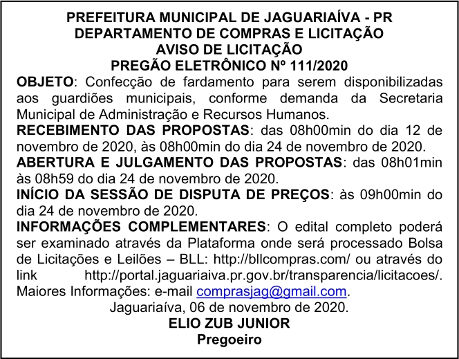 Aviso de Licitação Pregão Eletrônico Nº 111/2020