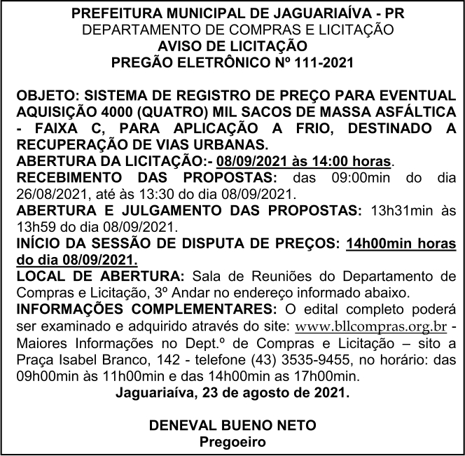 Aviso de Licitação Pregão Eletrônico Nº 111/2021