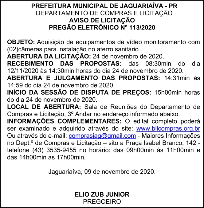 Aviso de Licitação Pregão Eletrônico Nº 113/2020