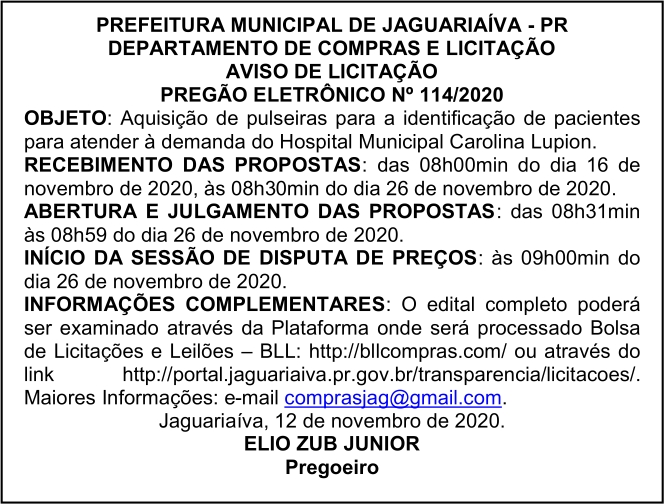 Aviso de Licitação Pregão Eletrônico Nº 114/2020