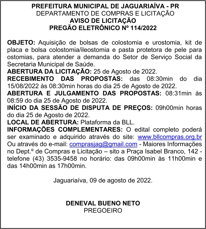 Aviso de Licitação Pregão Eletrônico Nº 114/2022
