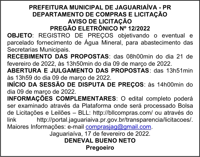 Aviso de Licitação Pregão Eletrônico Nº 12/2022
