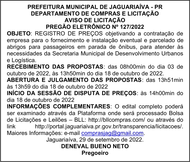 Aviso de Licitação Pregão Eletrônico Nº 127/2022