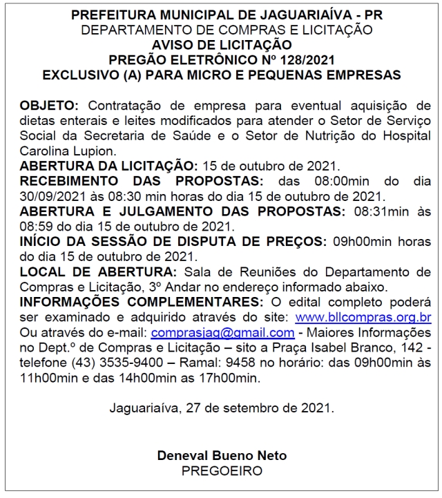 Aviso de Licitação Pregão Eletrônico Nº 128/2021