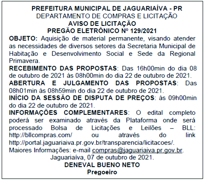 Aviso de Licitação Pregão Eletrônico Nº 129/2021