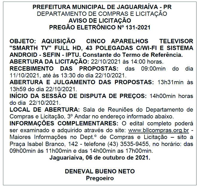 Aviso de Licitação Pregão Eletrônico Nº 131/2021