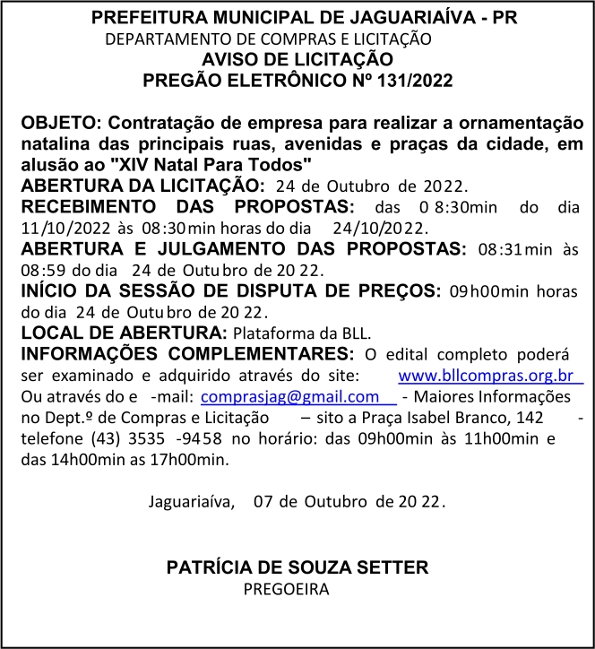 Aviso de Licitação Pregão Eletrônico Nº 131/2022