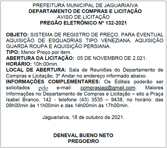Aviso de Licitação Pregão Eletrônico Nº 132/2021