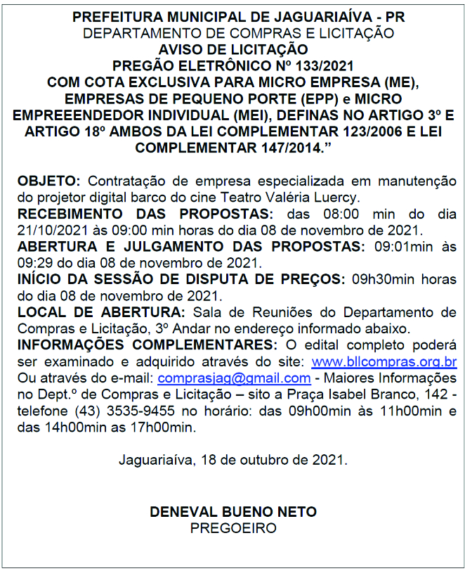 Aviso de Licitação Pregão Eletrônico Nº 133/2021