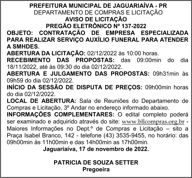 Aviso de Licitação Pregão Eletrônico Nº 137/2022