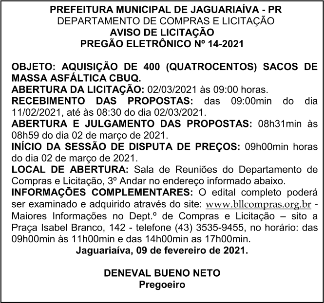 Aviso de Licitação Pregão Eletrônico Nº 14/2021