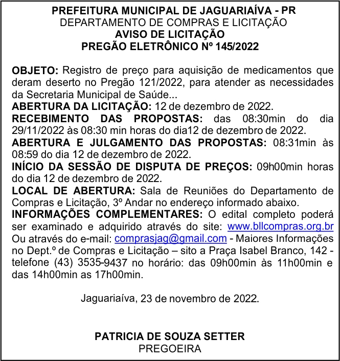 Aviso de Licitação Pregão Eletrônico Nº 145/2022