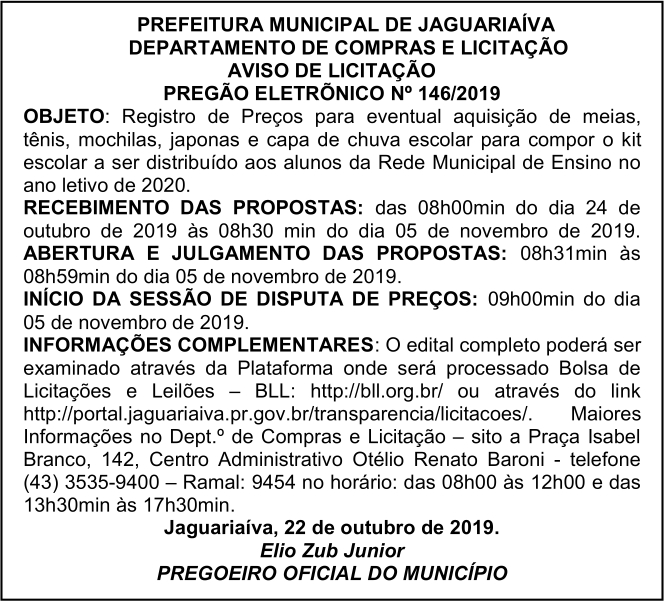 Aviso de Licitação Pregão Eletrônico Nº 146/2019