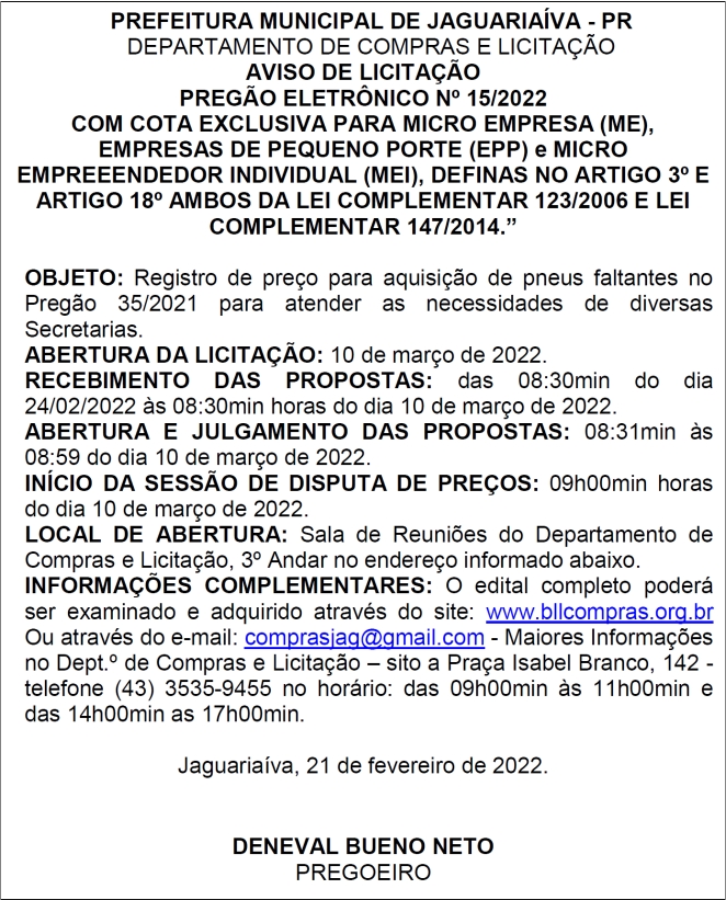 Aviso de Licitação Pregão Eletrônico Nº 15/2022