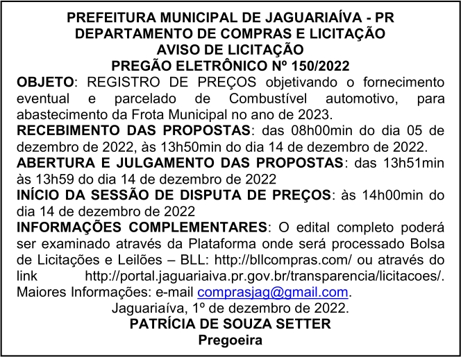 Aviso de Licitação Pregão Eletrônico Nº 150/2022