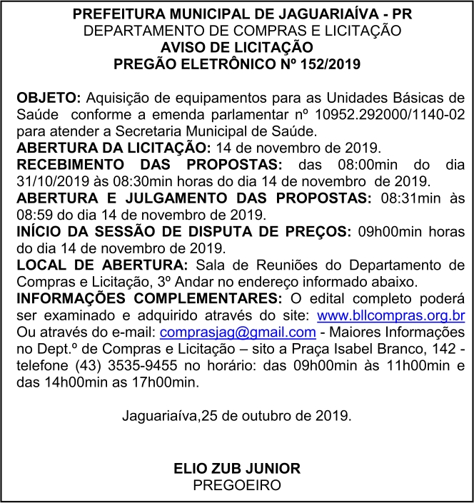 Aviso de Licitação Pregão Eletrônico Nº 152/2019