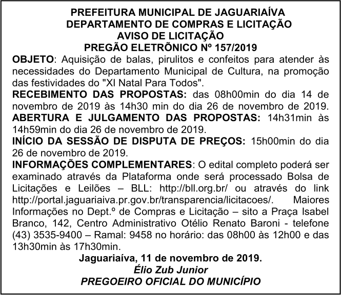 Aviso de Licitação Pregão Eletrônico Nº 157/2019