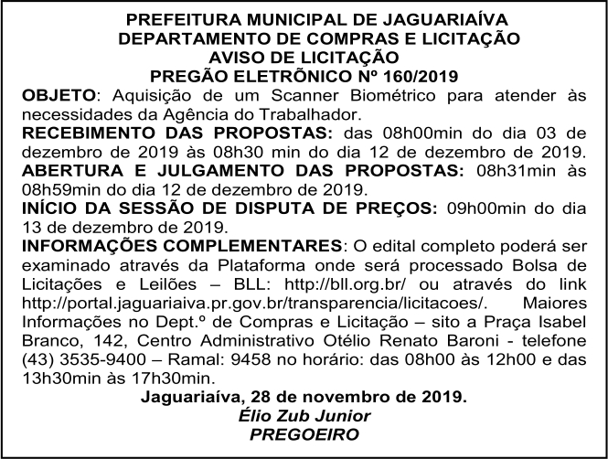 Aviso de Licitação Pregão Eletrônico Nº 160/2019