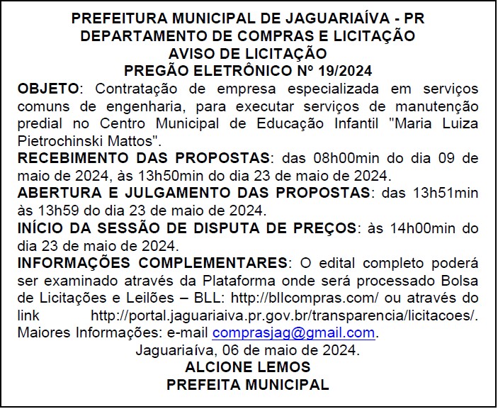 Aviso de Licitação Pregão Eletrônico Nº 19/2024
